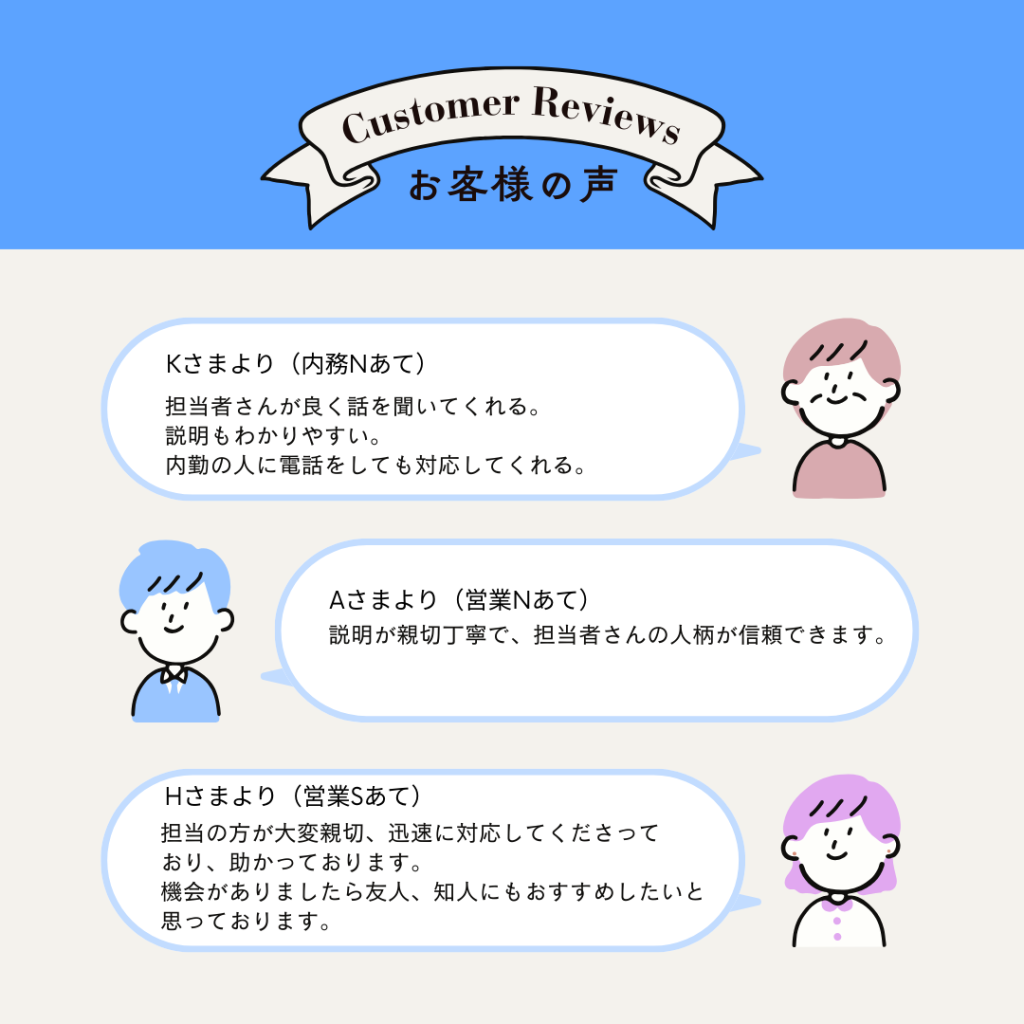 お客さまアンケートでいただいた、お客さまのお褒めの言葉を一部ご紹介いたします。